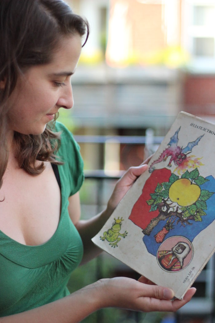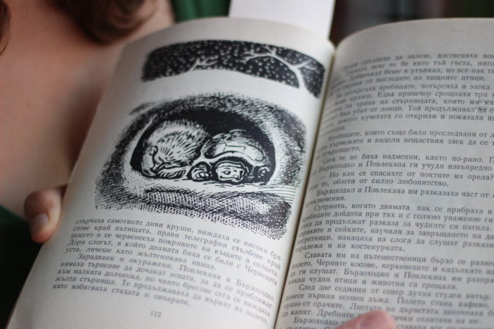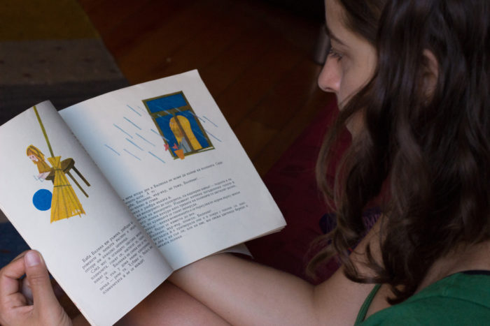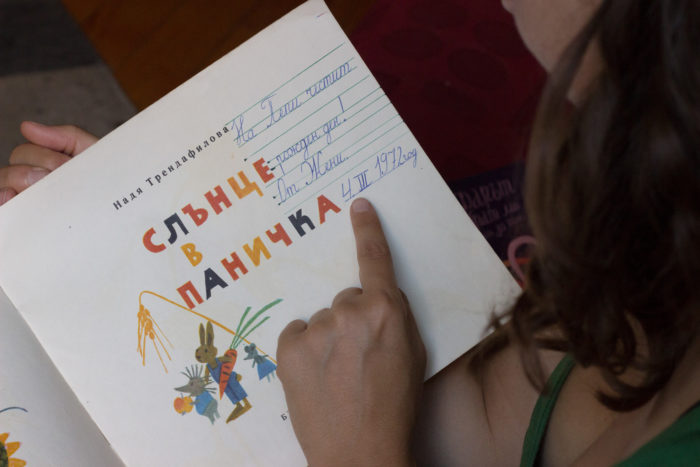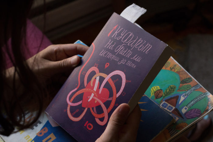 This is my friend Maia Iotzova, a filmmaker, an artist and a fellow Bulgarian. She agreed to be the first participant in my project. When we met, she showed me and talked to me about the books in Bulgarian in her home library. She is especially fond of the children’s books she has, some of which she has bought from street vendors in Sofia. She was happy to have found them, fortuitously, as they were books she used to have as a child, but didn’t keep. The book that she was reading at the time we met is called, fittingly, My Brother’s Suitcase: Stories about the Road. It is a book of short stories about language and migration; stories that trace the boundaries of home. For Maia this is an important book because it helps her reflect on and understand better her own experience of (im)migration. The epigraph to one of the stories caught my attention: “I am homeless, because there are so many homelands that make their home in me” (by Czech-born writer, philosopher and journalist Vilém Flusser).